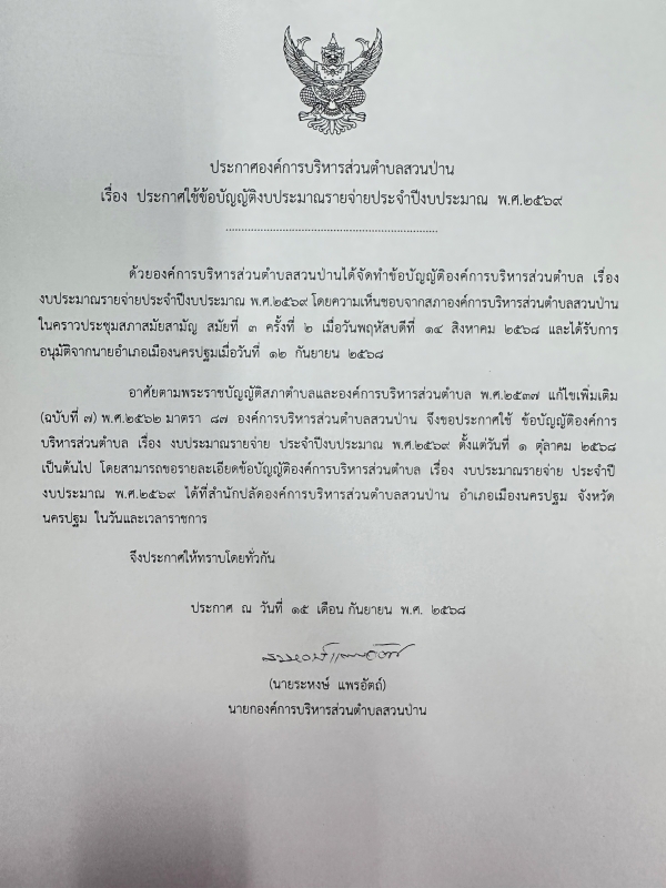 ประกาศ ใช้ข้อบัญญัติงบประมาณรายจ่ายประจำปีงบประมาณ พ.ศ. ๒๕๖๙