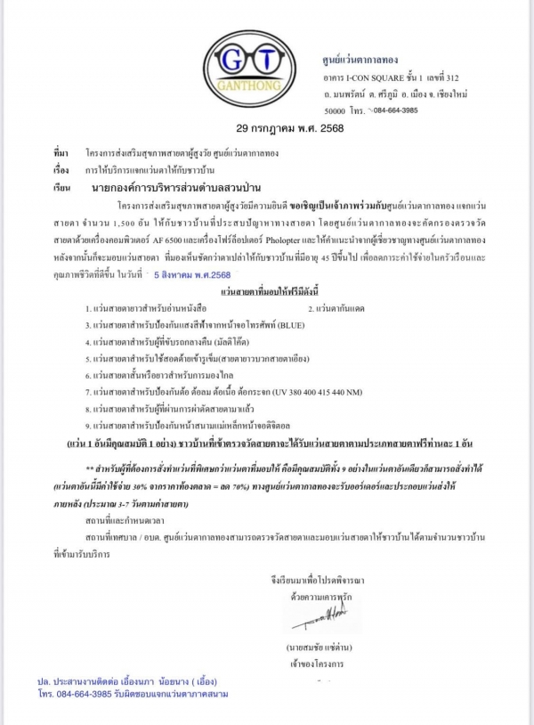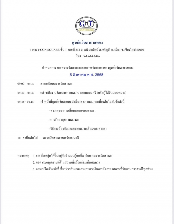 โครงการส่งเสริมสุขภาพสายตาผู้สูงวัย ศูนย์แว่นตากาลทอง จะมาให้บริการแจกแว่นตาให้กับชาวตำบลสวนป่าน68