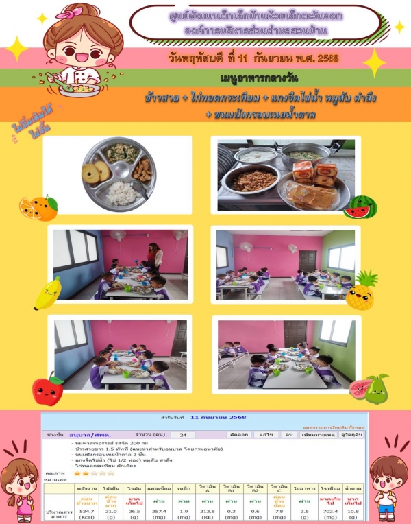 รายการอาหารกลางวันของศูนย์พัฒนาเด็กเล็ก 11/9/68