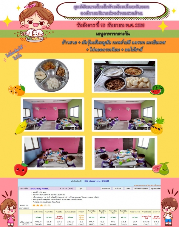 รายการอาหารกลางวันของศูนย์พัฒนาเด็กเล็ก 16/9/68