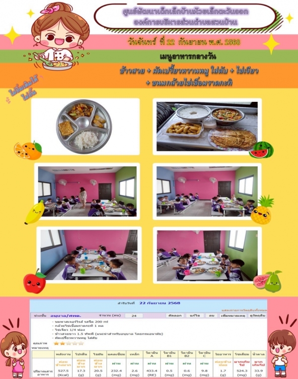 รายการอาหารกลางวันของศูนย์พัฒนาเด็กเล็ก 22/9/68