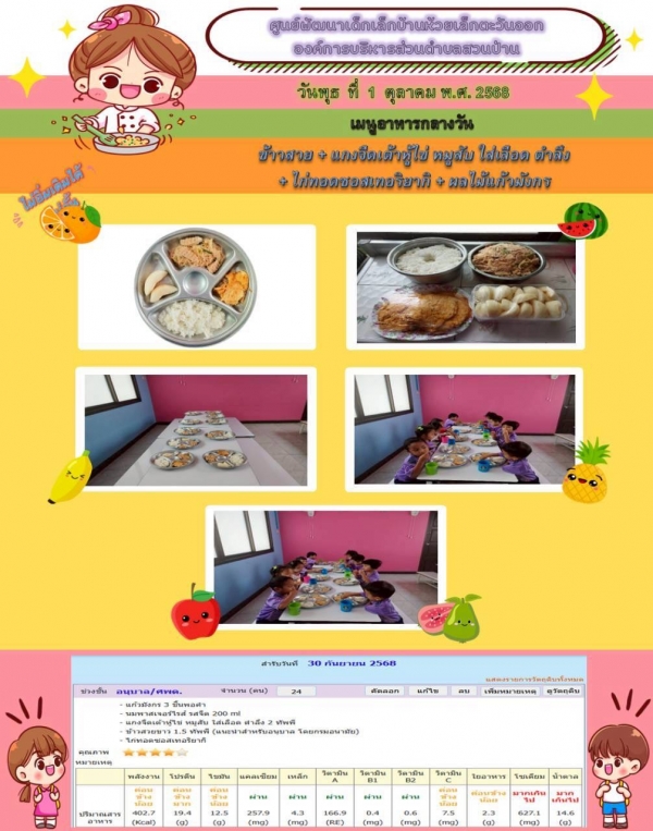 รายการอาหารกลางวันของศูนย์พัฒนาเด็กเล็ก 1/10/68