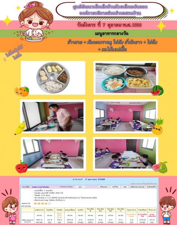 รายการอาหารกลางวันของศูนย์พัฒนาเด็กเล็ก 7/10/68