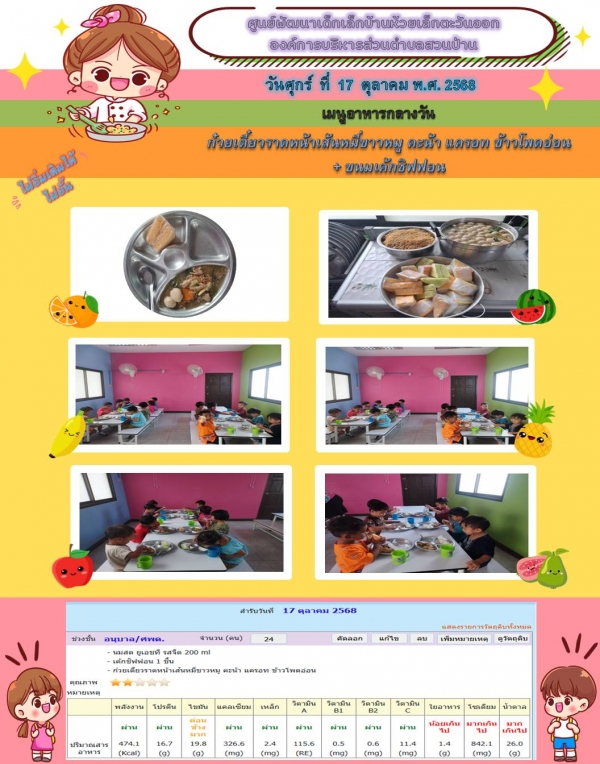 รายการอาหารกลางวันของศูนย์พัฒนาเด็กเล็ก 17/10/68