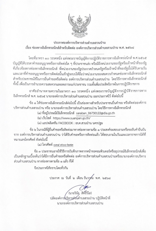 ประกาศ อบต.สวนป่าน เรื่องช่องทางอิเล็กทรอนิกส์สำหรับติดต่อ อบต.สวนป่าน พ.ศ. 2568