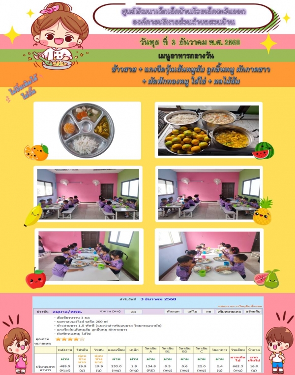 รายการอาหารกลางวันของศูนย์พัฒนาเด็กเล็ก 3/12/68