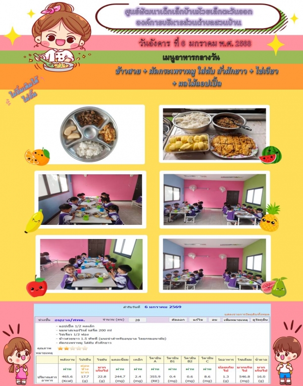 รายการอาหารกลางวันของศูนย์พัฒนาเด็กเล็กองค์การบริหารส่วนตำบลสวนป่าน วันที่ 6 มกราคม พ.ศ. 2569