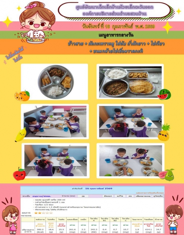 รายการอาหารกลางวันของศูนย์พัฒนาเด็กเล็ก 16/2/69