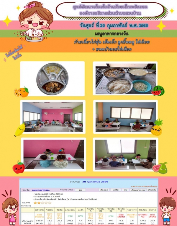 รายการอาหารกลางวันของศูนย์พัฒนาเด็กเล็ก 20/2/69