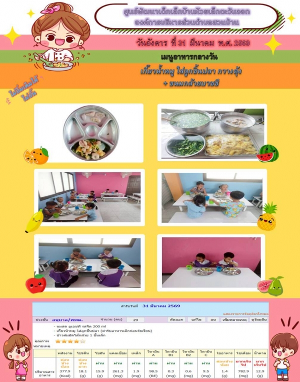 รายการอาหารกลางวันของศูนย์พัฒนาเด็กเล็ก 31/3/69