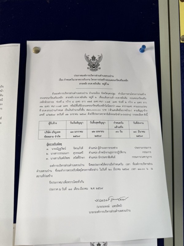 เรื่อง กำหนดวันเวลาตรวจรับงาน โครงการก่อสร้างถนนตอนกรีตเสริมเหล็ก